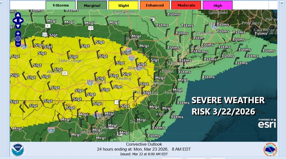 There could be a few thunderstorms in the mix and the Storm Prediction Center is indicating that there could be some risk for severe thunderstorms developing with this cold front. There is a marginal risk for isolated severe thunderstorms in New Jersey and a slight risk across some Western New Jersey counties and much of Pennsylvania. There is also risks for isolated tornadoes.