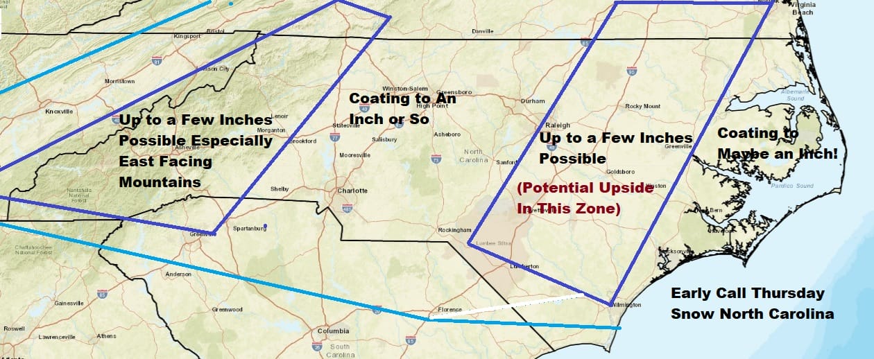 Since we have no use for snow forecast maps around here these days, here is an early call on the snow for North Carolina where I think the “brunt” of this will be. There is room for some upside here if the wave is more robust in nature as some models indicate.