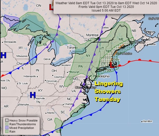 While the bulk of the rain was on Monday we still had some leftover showers to deal with overnight and for the first part of today. Low pressure is going to eventually move to the northeast. Most of the rain is done inland but we are stills see some showers around along coastal areas as well as into Southern New England. This should all move to the northeast and while most of the area will be cloudy to start the day, we might see some improvement later this afternoon in parts of Eastern Pennsylvania and Western New Jersey. Clouds will linger longer to the east.