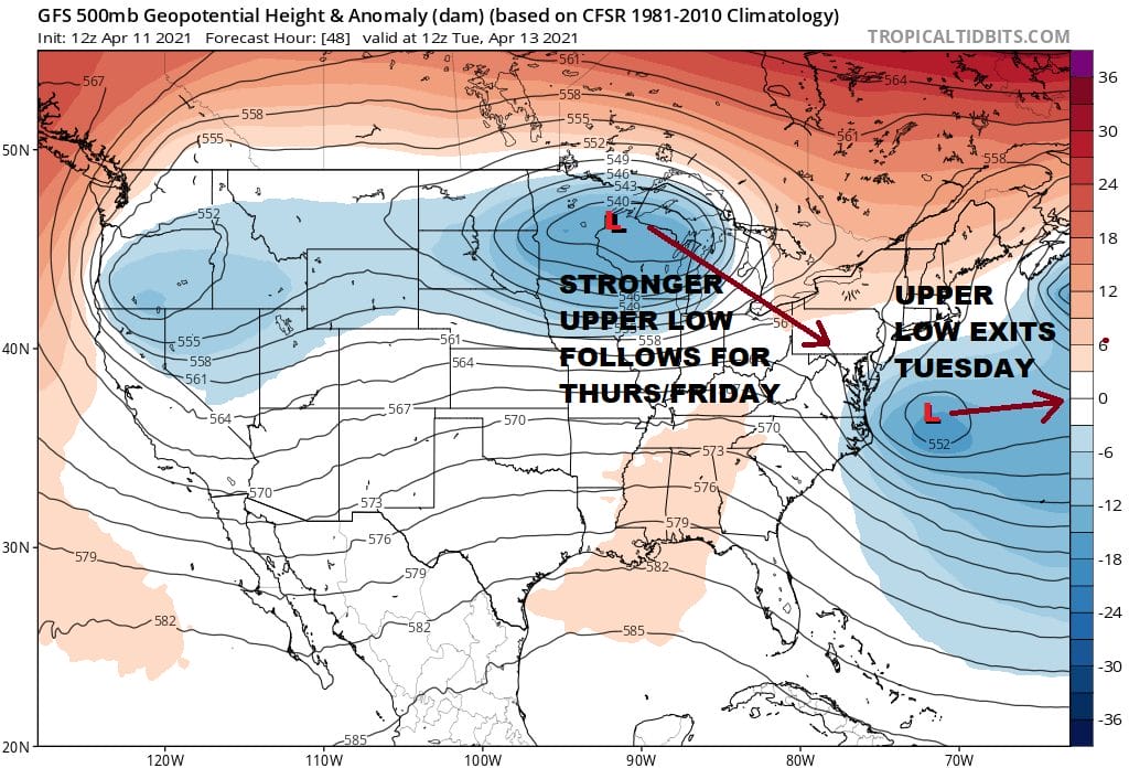 That upper low should finally pass by to our south and east early Tuesday and that could lead to some improvement. Rain will be gone by Tuesday morning and clouds should give way to sunshine rather quickly. Temperatures Tuesday should be back into the upper 50s and lower 60s. However there is a problem as the upper air map below shows.