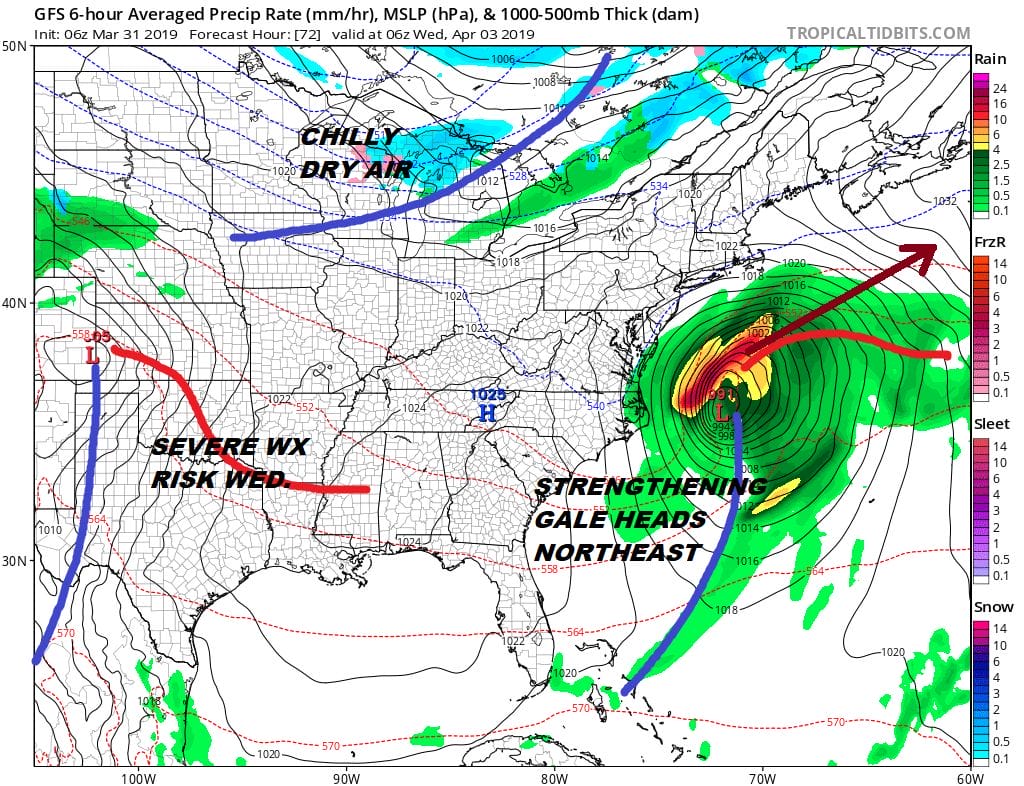 There isn’t much that has changed regarding how this developing low off the Southeast coast will behave. It looks to strengthen as it moves northeastward There isn’t much room for this to move northward closer to the coast. There is a general lack of storminess in the Atlantic which favors this system to move out more to the East than anything else. Clouds will be the main issue here late Tuesday into Wednesday morning before the system pulls way to the east. I would expect Wednesday and Thursday to be on the chilly side behind it with clouds and some sunshine both days and highs probably in the 40s to lower 50s on average. There is a system that will be coming out of the Southern Plains which will begin to spread severe weather risk across parts of the South beginning Wednesday.