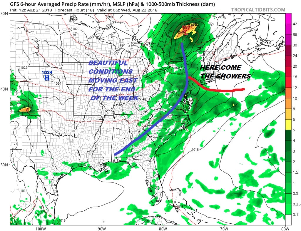 Wednesday we wait for a cold front to move through so it will be warm and humid with temperatures in the 80s and the chance for a shower or thunderstorm. Humidity levels will start to drop from west to east during the afternoon and evening and this sets us up for Thursday and Friday which will feature lots of sunshine low humidity and temperatures in the 70s.