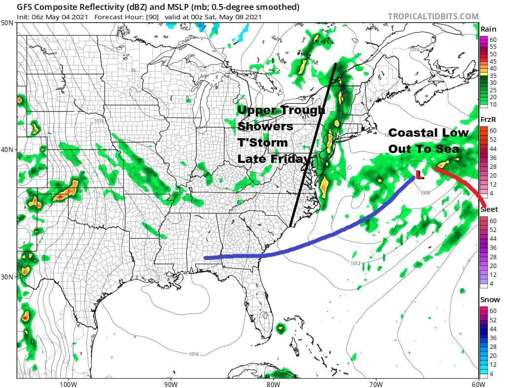 Wednesday we will see a developing low nearby with the warm front pushing north and the cold front pushing east. Look for some showers and maybe a thunderstorm or two into early afternoon until the front passes offshore. Leftover clouds should give way to some late day sun. Temperatures Wednesday will be in the 60s.