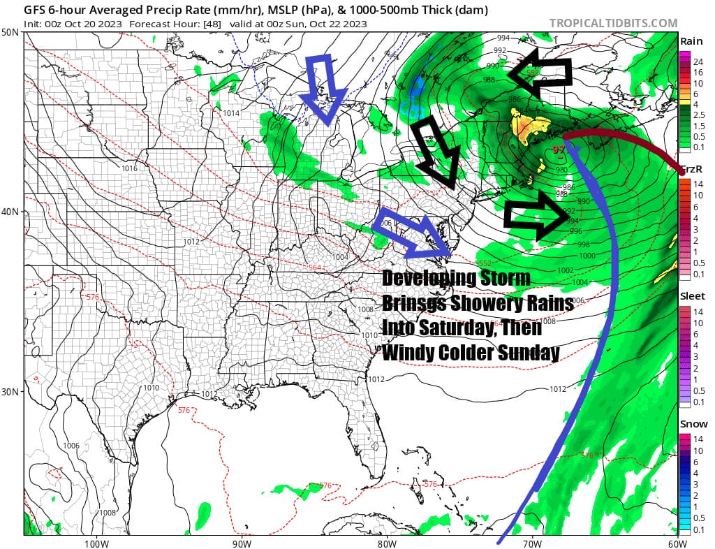 We have arrived at Friday and the doorstep of the weekend and once again for the 7th straight weekend and 21 of the last 24, we are going to see rain on at least one of the two weekend days. In fact we are seeing it today as weak low pressure off the Mid Atlantic coast moves northeast today into tonight. We also have a cold front moving east across the Appalachians and between the two systems we will see clouds and showers raound today.
