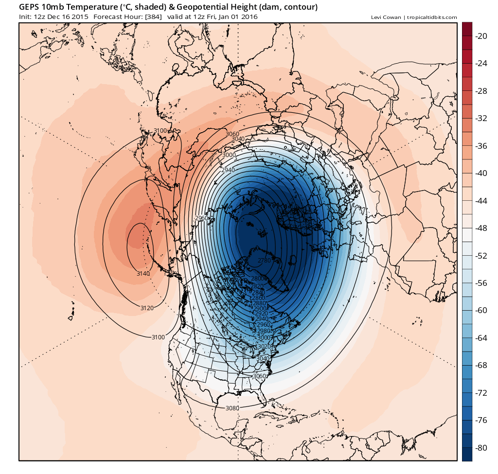 The map above is the upper flow at the very top of the atmosphere or 10 mb. We are talking the stratosphere here. Basically we are talking above 33,000 feet where jets fly. You will notice right away that the flow here is dominated by only a few features which is unlike the lower levels where you have more numerous lows and highs, troughs and so on. The map is the current look and you can see where the vortex is sitting. Now one of the arguments or predictions for a change is for that vortex to eventually stretch and split which would creating rising pressures across the pole and displace cold air southward in the lower atmosphere. Now there is a time lag from when it happens up there and when it translates down here. Models have been hinting at such and event and the last several runs seem to be on a trend.