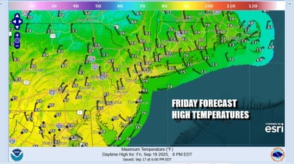 Friday meanwhile will be a warm day with sunshine and just a few passing clouds. Highs will reach the low and even some middle 80s. Even the beaches will be warm thanks to a rare northwest wind that develops. Then cooler air comes in behind the front which will drop southward into the Middle Atlantic states. Saturday will be a partly to mostly sunny day and so will Sunday. High temperatures both days will be in the low to middle 70s for the most part. Most nighttime lows both Saturday and Sunday will be in the 50s. No rain is in the forecast all weekend and we may have to wait until the middle of next week before we see any risk for rain or showers.