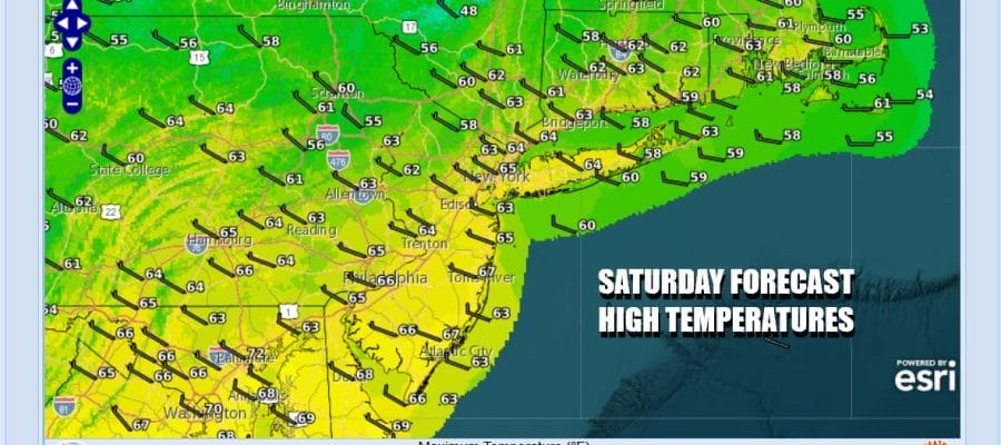 The weekend is underway but when we look at the satellite loop we can still see the rotation of clouds over much of the Northeast. This means that this will not be a picture perfect day. As you go south through New Jersey , Southeast Pennsylvania and points south you will likely see more in the way of sunshine. However if you head in the other direction, it will be more in the way of clouds with some limited sun in the mix. Throw in the chance for some inland showers like yesterday and you have a mixed weather day for Saturday. Highs today at least will be back into the low and middle 60s.