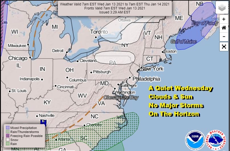 Quiet and mostly cloudy weather continues Thursday into Friday. Again there will be a few breaks of sun in the mix. Highs Thursday will be in the mid to upper 40s and Friday’s highs will be in the upper 40s to near 50. Low pressure moving over the Great Lakes swings a cold front to the East Coast with not much to it other than some showers late Friday into early Saturday. The GFS model develops a wave on that front and that could prolong some showers Saturday morning along the coast. Weather should improve later in the day Saturday with increasing winds, clouds and some sun with temperatures trending lower after early day highs in the mid to upper 40s. Sunday will be on the breezy side with some sunshine. Highs will be in the upper 30s and lower 40s. More of the same Monday with highs in the 30s.