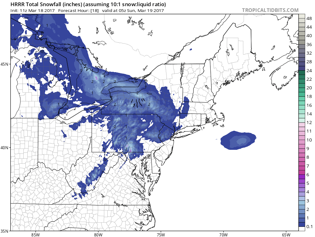 Radars are showing some blotchy areas of rain and wet snow and some of it isn’t reaching the ground. None of it appears to be particularly impressive at the moment. The HRRR snow forecast map through 1am Sunday shows how unimpressive this all is.