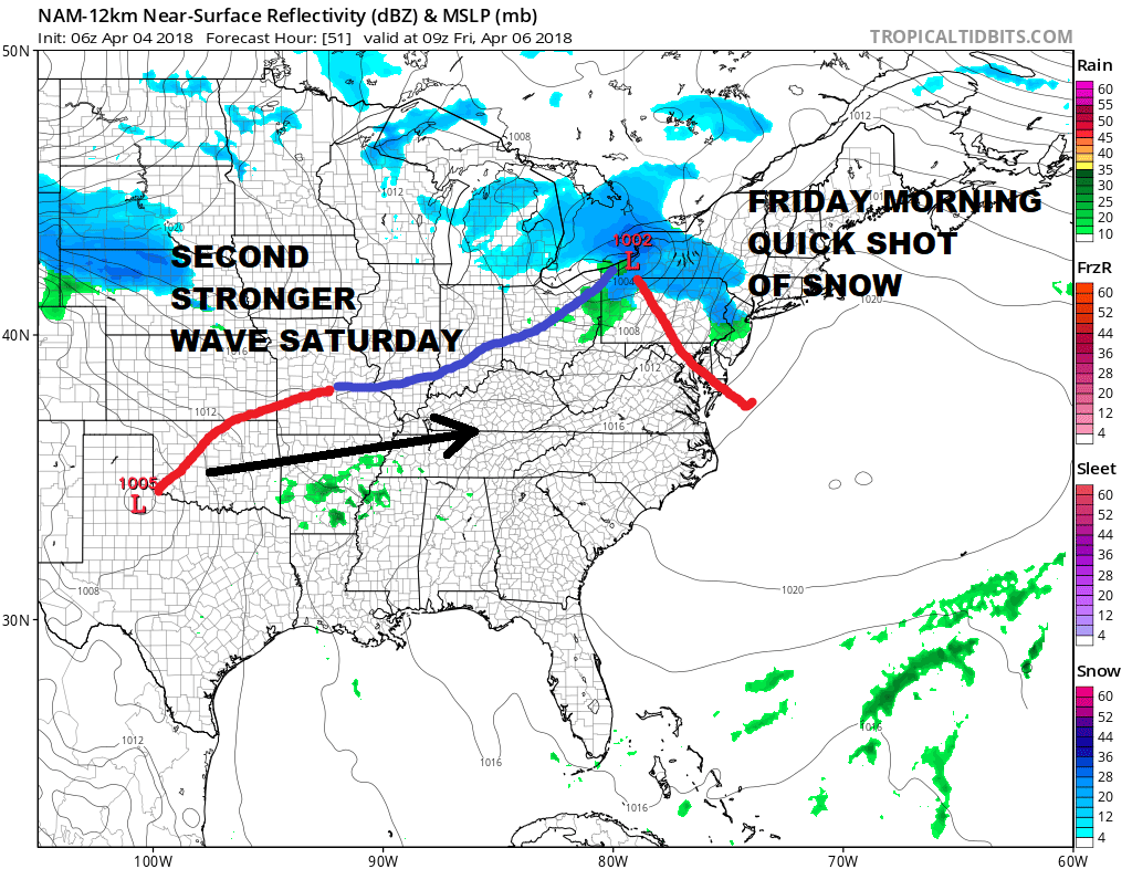 The more important system is for late Friday night into midday Saturday. This one looks just like the one we had Monday so it will depend on timing and most important, the intensity of the snow. If we get some bands of moderate to heavy snow..then it will accumulate on all surfaces again. I would say several slushy inches seems doable for Saturday morning and this could be another situation where models shift northward a bit as we get closer. The NAM did well with the Monday system so we will be leaning in that direction again.