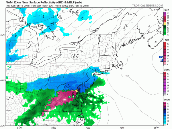This is the NAM’s view of all this Saturday night. It bring the snow in faster over New Jersey during the afternoon and it is all done long before daybreak. The development of the heavier precipitation will depend on the low as it move east of the Delaware coast. There will be a brief period of rapid intensification that will occur with pressures dropping rapidly for about six hours between 7pm & 1am. During this time frame some heavy preicipitation will develop and it simply becomes a matter of when it does and where that precipitation lines up. Should development be more robust than accumulations could skew higher but of course that is a big if. I’m uncomfortably comfortable with this forecast and we need to recognize that the bust possibilites here are high.