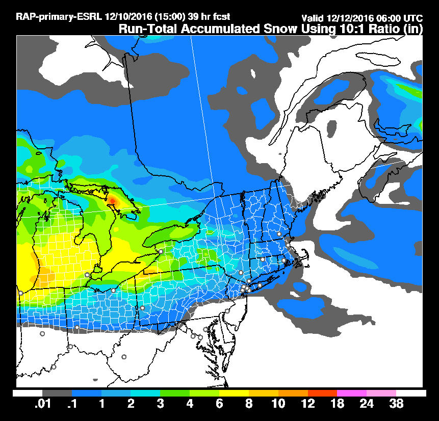 Amounts were raised this morning though I can’t understand why given the latest model runs. Warm fronts are always tricky to forecast and can burn your forecast in either direction. They seem to think cold air will hold on longer for inland areas. Coastal area numbers look okay to me. The latest RAP model goes out to 1am Monday morning. There will be a few more hours of snow to follow this time frame.