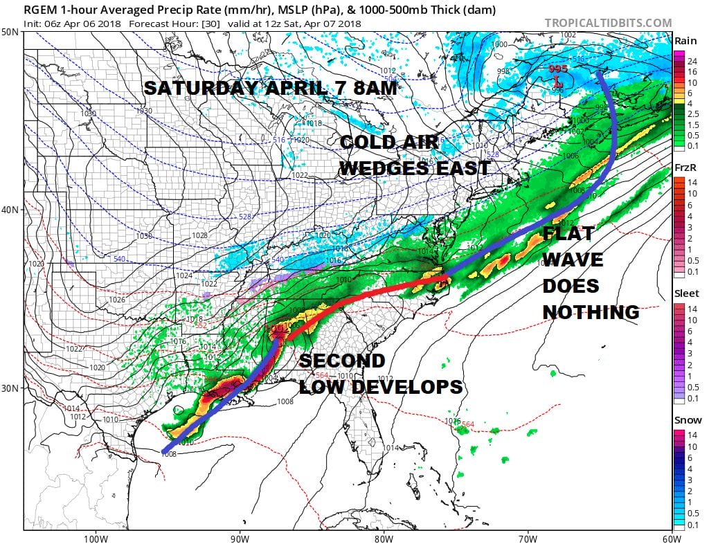 Tonight we begin and end with clouds and there could be a few rain showers in the mix. By morning colder air will begin to arrive. Most lows will be in the 30s. Then we watch the evolution of this system for Saturday. The entire flavor of all this has changed over the last few days. The lead low that was supposed to come out as a vigorous wave is barely visible while a second low forms in the Gulf States Saturday morning.