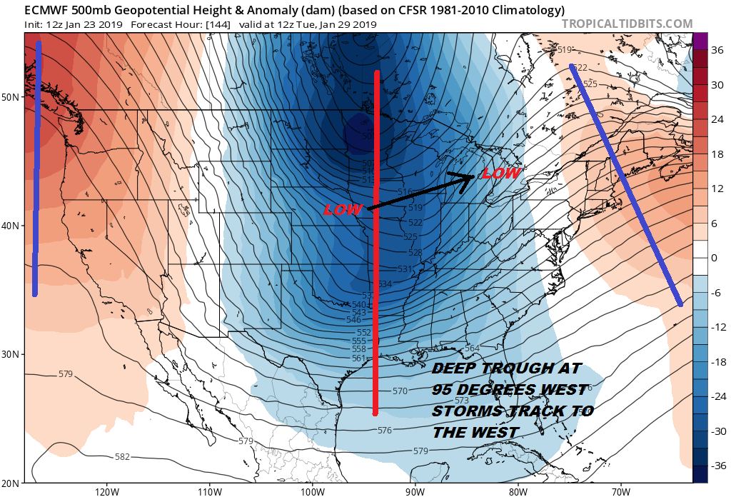 You can’t have snow with an upper air map looking like this. This is for next Tuesday and the the European at least resolves all this with a deep trough at 95W. The problem with all the big events in the stratosphere is it doesn’t guarantee that the troughs and ridges will set up in a favorable way for snow in the East. The trough is 900 miles too far west. The European also suggests that whole vortex in the upper middle of the map drops southward into the Great Lakes later next week.