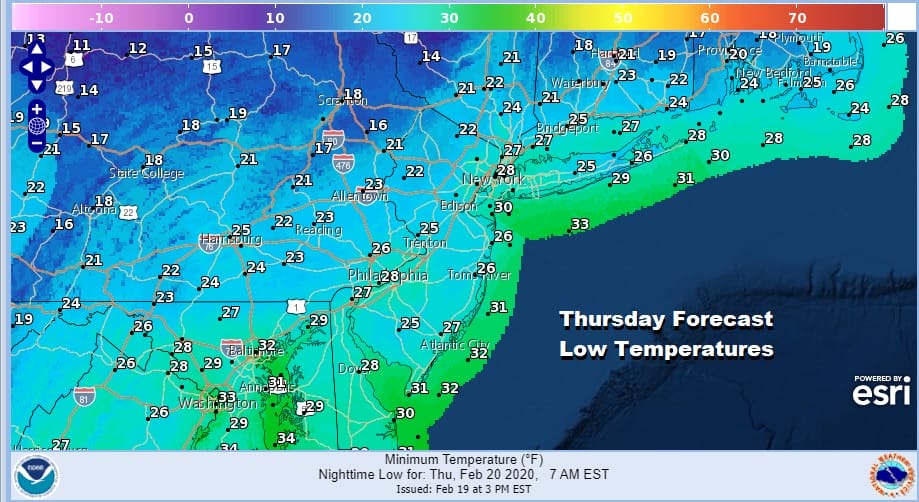Under clear skies tonight lows will be in the 20s with some teens in cold spots. Thursday will be day of sunshine and high clouds with highs in the low to mid 30s followed by another cold night Thursday night. Friday morning lows will be in the teens to near 20. The storm to the south passes well offshore Friday as high pressure moves overhead. Sunshine Friday will take highs again only to the low and mid 30s. Then we warm up over the weekend with some sunshine for both days.
