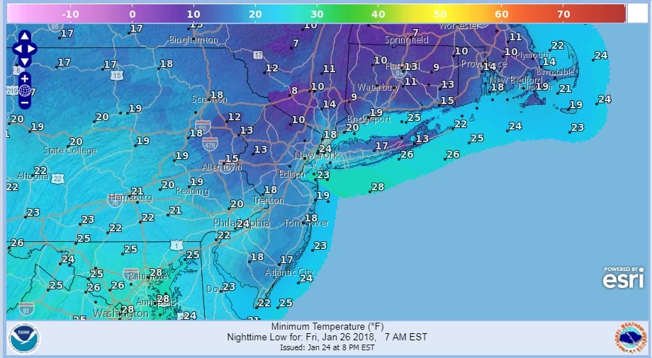 To the west dry air and clear skies will move in Thursday as high pressure builds in. We should see a good deal of sunshine with highs mostly in the low to mid 30s. Another cold night is in store for our region Thursday night into Friday morning with most lows in the teens with even a few single digits showing up inland while urban locations will probably hold in the lower 20s.