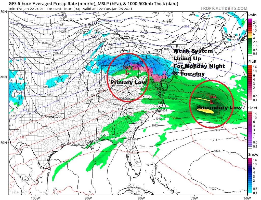 Low pressure coming out of the Southern Plains will head northeast into the Ohio Valley. Then it hits the brick wall of the block and redevelops to the east. However there is a problem regarding snow. First off the block is still strong and you will notice that the precipitation hits a wall around or just north of NYC and then stops moving north and begins sliding to the east. Secondly there is the secondary low which forms well to the east of the Carolinas and moves east. The result is a disjointed looking system. The secondary developing to the east will likely weaken the snow area Monday night and Tuesday. It doesn’t completely disappear but the system remains weak and disorganized. This was never going to be a big system to begin with so right now my thinking is that this will have the potential the leave a few inches so lets call it a 1-3/2-4 inch type snow fall Monday night into Tuesday. There are still a few other issues to figure out but those numbers would be the maximum I would go with at this time. Meanwhile a follow up storm has more support and will actually  become a monster storm in the Atlantic late next week. Here too the issue is the block. The GFS is further north today but again the primary hits that brick wall. The secondary explodes offshore and moves east. On face value this would bring big snows to the areas in the Mid Atlantic states but on this run at least falls short of reaching NYC and Southern New England. Many weather model runs to go here and if the block can relax a bit this could wind up pushing further north. We will keep an eye on this over the weekend as well as the system for Monday night and Tuesday.