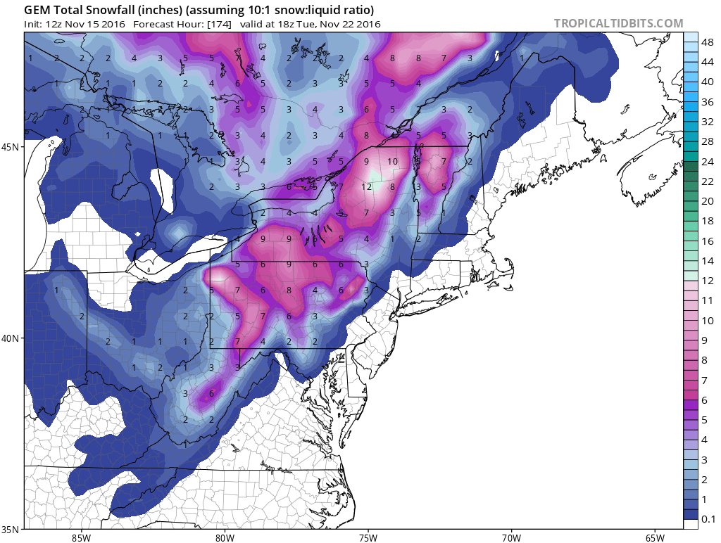 Back to this weekend you can see the GFS and Canadian snowfall forecast maps above. The European snowfall map can’t be shown however if you take the Canadian map and double the snow amounts.