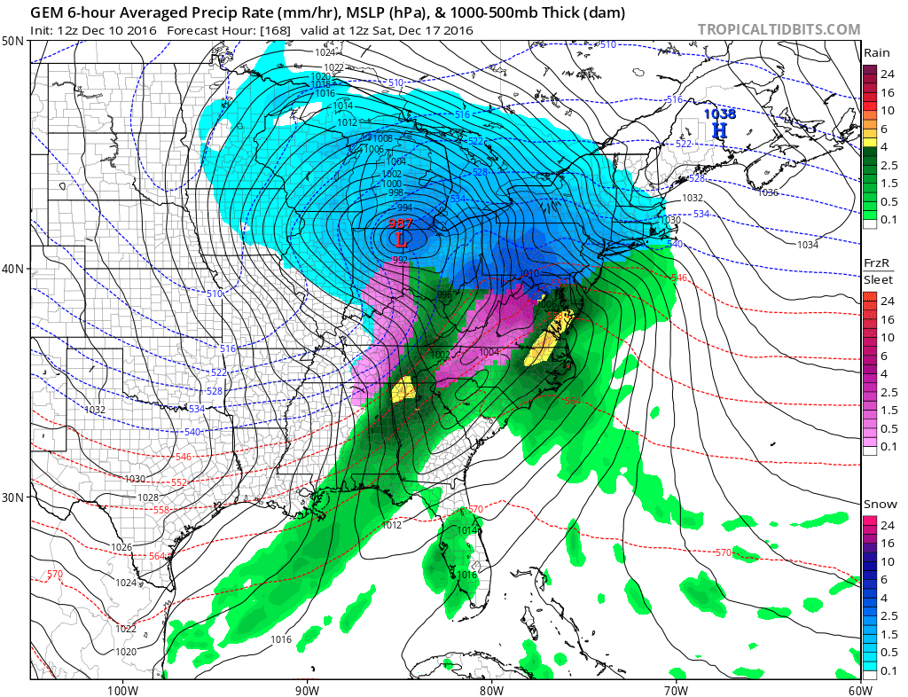All three models for the last 3 days have been suggesting the possibility of a snow/ice storm for next weekend. Today’s runs have provided the strongest indication yet that this is going to be on the table. The European model run is particularly intriguing as it takes the surface high into Maine and creates a cold air damming situation down the Appalachians. Remember this will be arctic air coming late this week and it will be hard to scour it out as it becomes trapped inland. This would create a serious ice storm situation in the interior Middle Atlantic and Northeast US. Obviously many runs to go here but it seems something may be in the cards. First things first will be Wednesday. Regardless of snow or not the second half of this week will be very cold. We should see one day with daytime highs possibly not much above 30.