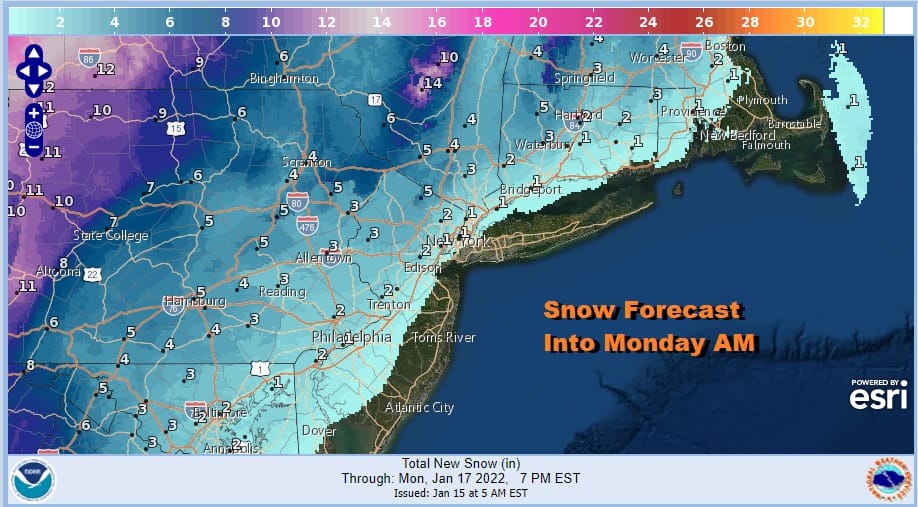 Latest National Weather Service snow forecast maps continue to cut back snow forecast amounts slightly from Eastern Pennsylvania eastward and for areas northeast into New England. This makes complete sense given the loss of the cold high an the track of the low which will be well inland. Even a developing secondary won’t save the day for snow lovers. I’m anticipating winter weather advisories to go up north and west of I-95 for Sunday night but there is really no need to put them up this early in the game.