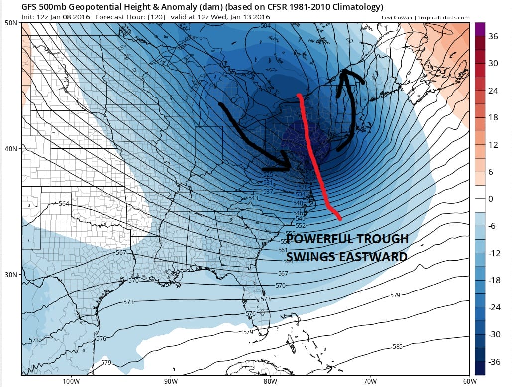 The fact that it is going to redevelop so close doesn’t allow time to get precipitation going until its too late. However the upper trough is very strong and it is likely that some snow will be produced when the trough moves through. How much? Sometimes it could be as little as a coating. Sometimes there could be a strong enough band of snow to produce some local amounts of 1 to 2 inches. Models seem to be showing at least some snow when it moves by so we will go with it. If the trough does not dig than this could be much ado about nothing. The models seem to be holding their own on this idea so we will stick with it.