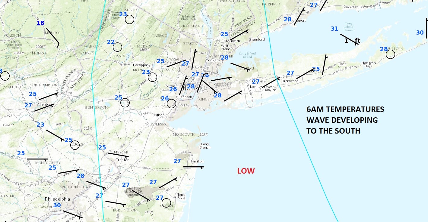 Two things going on that are very important. The first is that we have the wave developing on the warm front off the New Jersey coast. What that is doing is pinching the cold air and holding it in. Temperatures everywhere are in the 20s and getting that extra hour or two of snow means an extra few inches thanks to the loaded local radars.