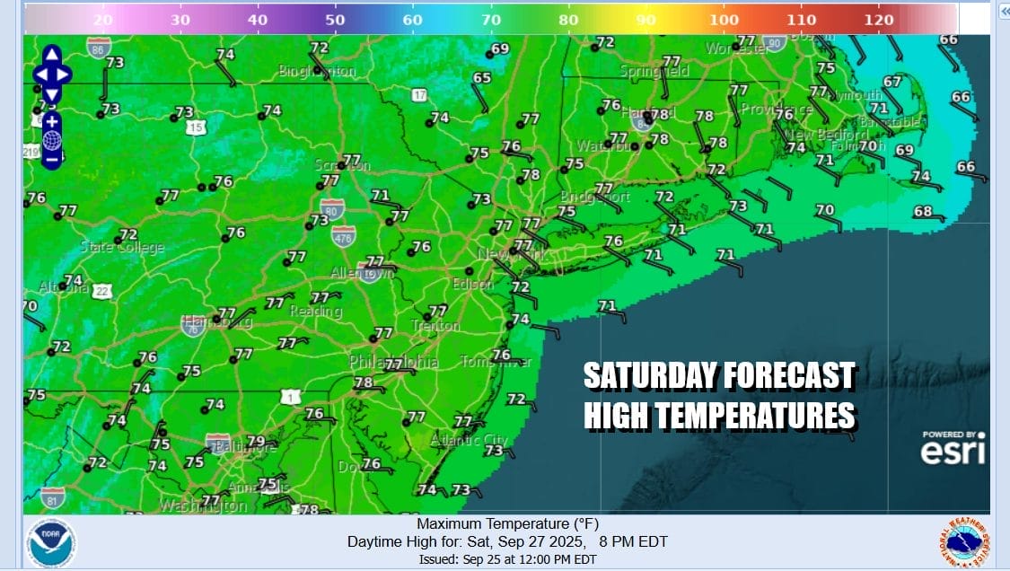 Sunday see highs in the low to mid 70s with clouds and some developing pm sun. Monday looks like a nice day of no worse than partly sunny skies with highs in the 70s. The same holds for Tuesday but Wednesday and Thursday will be cooler with a gusty northeast wind thanks to that large high building into New England and Atlantic Canada. Highs Wednesday and Thursday will likely be mostly in the 60s.