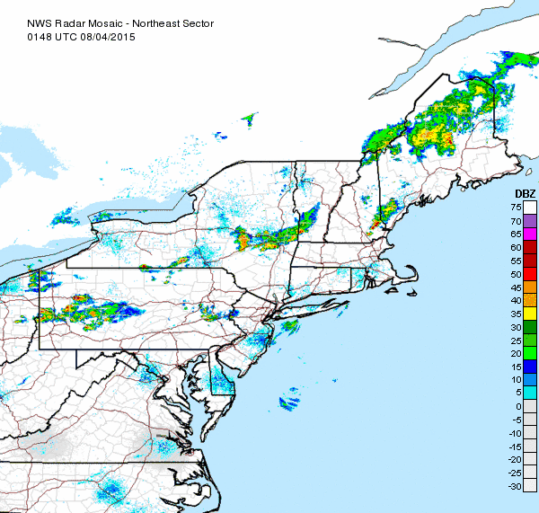 Radar is showing some thunderstorm activity back in Pennsylvania and they could effect parts of the area overnight. None appear to be severe. This is occurring ahead of the arrivial of dry air that will begin to move in on Tuesday.