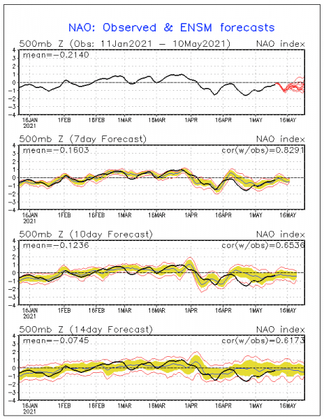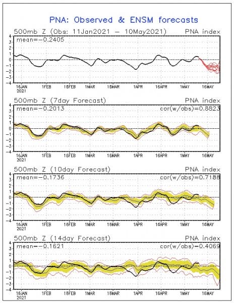 Troughs meanwhile keep dropping into the Rockies where winter keeps hanging on in some areas. The Pacific North America index is not in a good place for the Eastern US as it is negative and goes strongly negative for the rest of the month.
