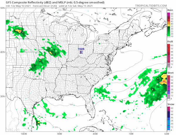 Think back to the warmer than normal mostly uneventful month of March and we had the North Atlantic Oscillation or NAO positive which means lower than normal pressures in the North Atlantic. Weather systems tend to move along in this set up. Since mid April we have reversed this as the NAO went negative and is forecast to remain negative possibly for the next 2 weeks. Higher than normal pressures in the North Atlantic displace the jet stream further south and that also puts us in a not so good place overall.