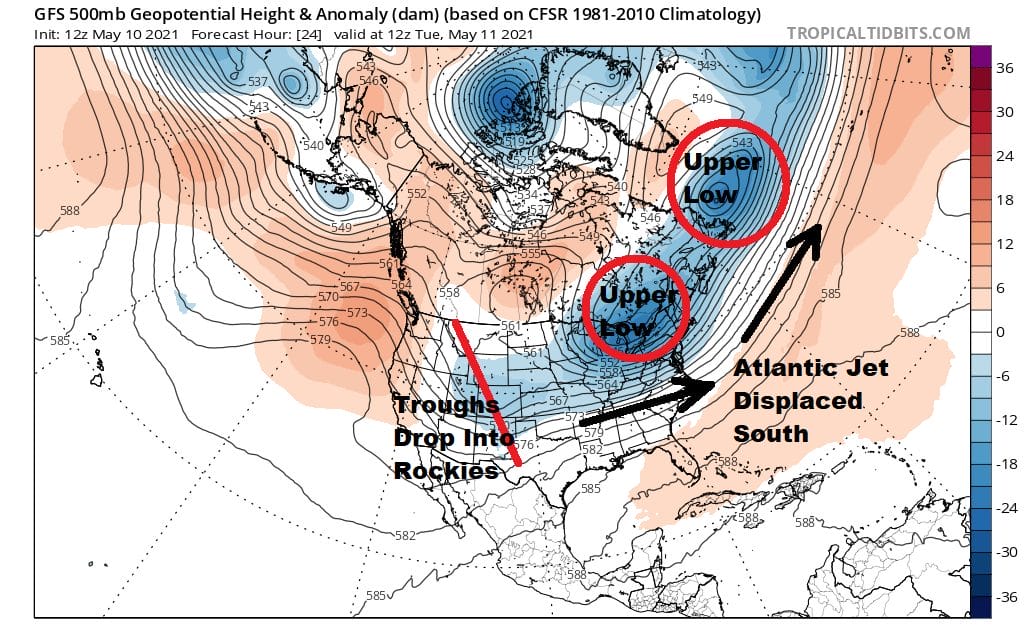 Think back to the warmer than normal mostly uneventful month of March and we had the North Atlantic Oscillation or NAO positive which means lower than normal pressures in the North Atlantic. Weather systems tend to move along in this set up. Since mid April we have reversed this as the NAO went negative and is forecast to remain negative possibly for the next 2 weeks. Higher than normal pressures in the North Atlantic displace the jet stream further south and that also puts us in a not so good place overall.