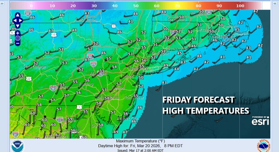 Some showers will arrive by later afternoon and evening and once again this front is moving along so the rain from this system should be done by Monday morning from New York City north but to the south it could linger a little longer. A colder air mass from Canada will begin to build into the Northeast for Monday and Tuesday. Monday highs will be in the 50s with a northwest wind. By Tuesday morning we will be in the mid 20s to lower 30s. Tuesday looks to be dry, sunny, but cold with highs just in the low to middle 40s. Enjoy the first weekend of the new spring season!