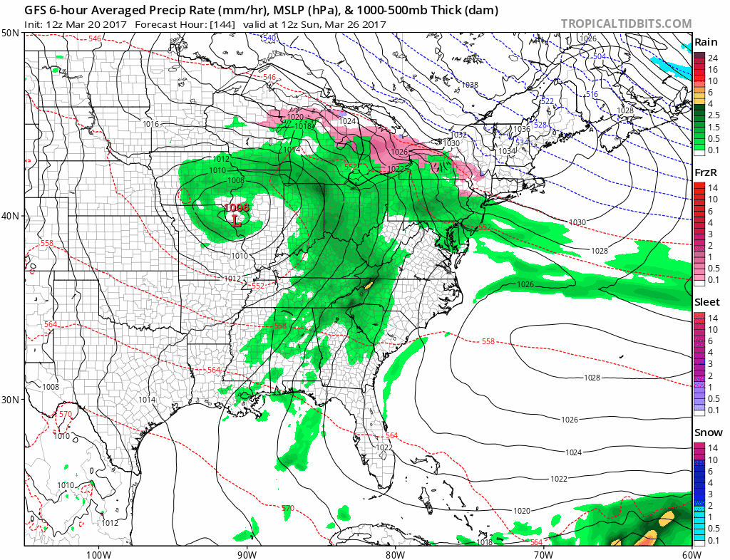After Saturday it looks like it may get soupy for a few days. low pressure gets ejected out of the Southern Plains and heads northeast. Thanks to some blocking that is developing the low will track northeast into Illinois and then east from there, redeveloping off our coastline during Monday.