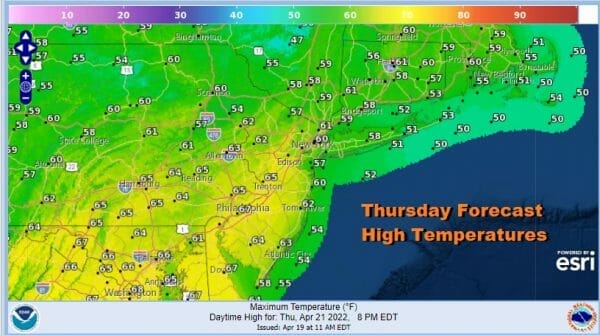 Friday could turn out to be the best day of the week as the air behind the front is not all that cold. So with the strong April sun we should see highs reach the mid 60s to lower 70s Friday afternoon. Saturday we will be a little cooler with some sunshine and highs in the upper 50s to lower 60s. The weather models do not show sustained warmth meaning that yes we could warm up for a day or 2 but as far as it lasting longer than that, it seems unlikely. We will attempt to warm Sunday into Monday because the next front won’t arrive until Tuesday. Wind direction will impact temperatures so we could see a wide range of highs Sunday from the 60s from NYC north and east to the 70s south and west. We don’t see any rain in the cards until next Tuesday when the next important cold front arrives. Enjoy the relatively calm weather ahead.
