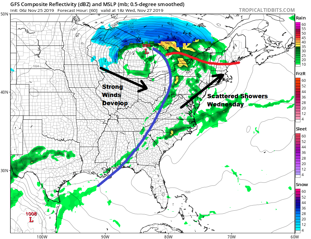 The gradient tightens Wednesday night as low pressure heads into Maine and then to Nova Scotia strengthening along the way. Winds are going to increase Wednesday night and Thursday morning we will be seeing northwest winds at 20 to 30 mph with some gusts to 40 mph. This is going to be an issue for Thanksgiving Day Parades in NYC & Philadelphia where balloons may not be launched with these gusty winds being forecast.