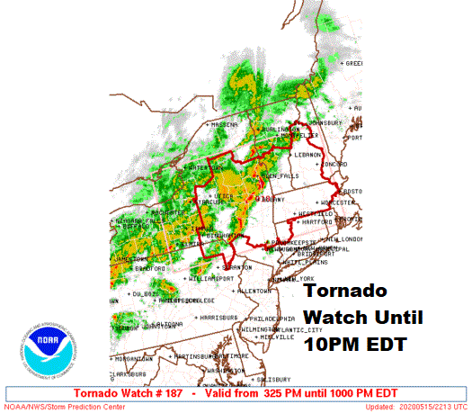 We do have a working tornado watch in the upper Hudson Valley in New York State but we don not anticipate a widespread severe thunderstorm watch being issued for our area. After a warm and somewhat humid day (for this time of year) loaded with sunshine and highs in the 80s, a cold front is approaching now with showers and thunderstorms ahead of it as the radars below suggest.