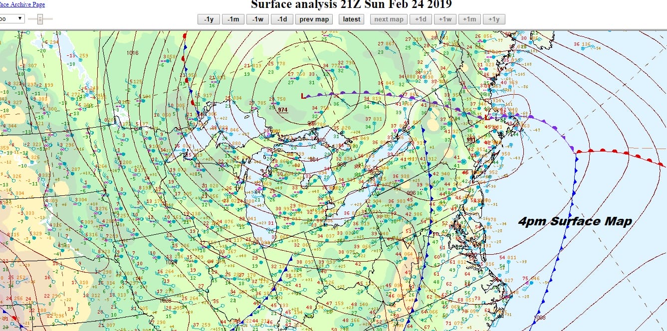 We are waiting for a cold front to sweeping eastward across Pennsylvania to make it to the coast. This should occur in a few hours. Once that happens the winds will increase sharply. On the 4pm surface map the major storm sitting north of Lake Huron is churning away as its arms spiral around.
