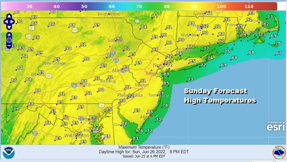 We have another summer day across Eastern Pennsylvania and no rain is in the forecast so go ahead with outdoor plans. It will be a very warm to hot day and humidity levels will be higher today making it more uncomfortable. There will be some showers and thunderstorms in Western NY and Western Pennsylvania as a cold front approaches. However that front won’t be close enough today to cause any issues. Highs this afternoon will be in the upper 80s to lower 90s. Local sea breezes will develop along the immediate coast providing some relief at the beaches. Tonight will be a warm humid night with lows in the upper 60s inland and mostly low 70s along the coast.