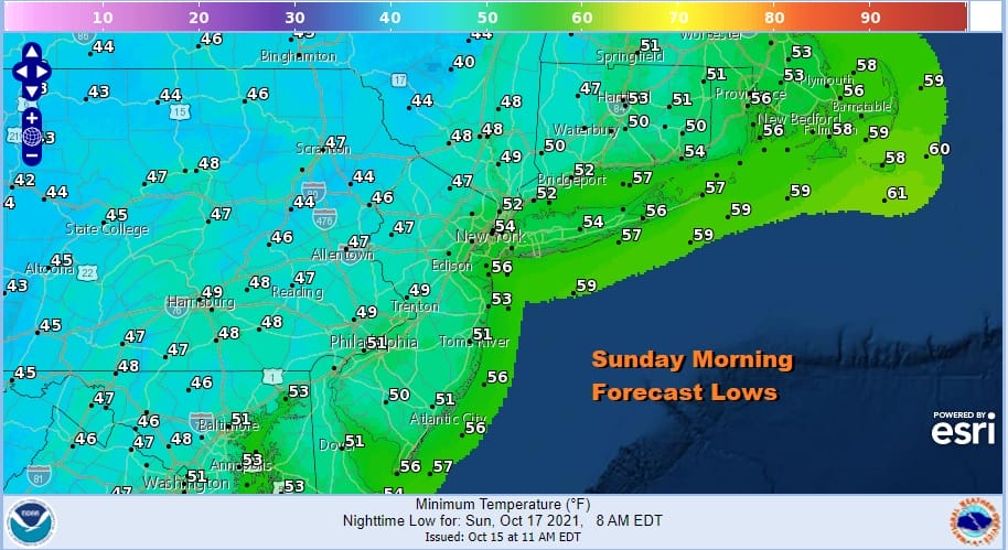 Cooler air follows Sunday morning when most lows will be in the mid 40s to lower 50s. The cold upper trough will be over the Northeast Sunday into Tuesday of next week and there will be little ripples moving along it. This will produce some clouds to mix with sun during Sunday and there is the outside chance for a brief shower. Temperatures will be mostly in the 60s for highs and then head down into the 40s to near 50 degrees Monday morning.