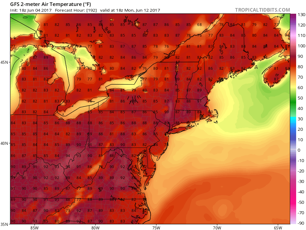 The existence of this cut off is important. If it is there then there could be clouds and onshore wind complications for a few days which could impact temperatures though the GFS model doesn’t show this on its temperature maps below. If the European model is right there is no cut off low off the Middle Atlantic Coast, then look for hot and increasingly humid days developing early next week.