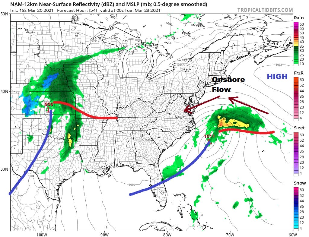 Monday we will should see some sunshine but we will need to keep an eye on low pressure well offshore underneath the high to the east. We are on the northern edge of the onshore flow so I think we should see a fair amount of sunshine. However to the south an easterly flow begins to set up and this could create some cloud issues Monday night. The wind off the ocean will hold highs down a bit but highs should reach the 50s along the coast and upper 50s to lower 60s inland.
