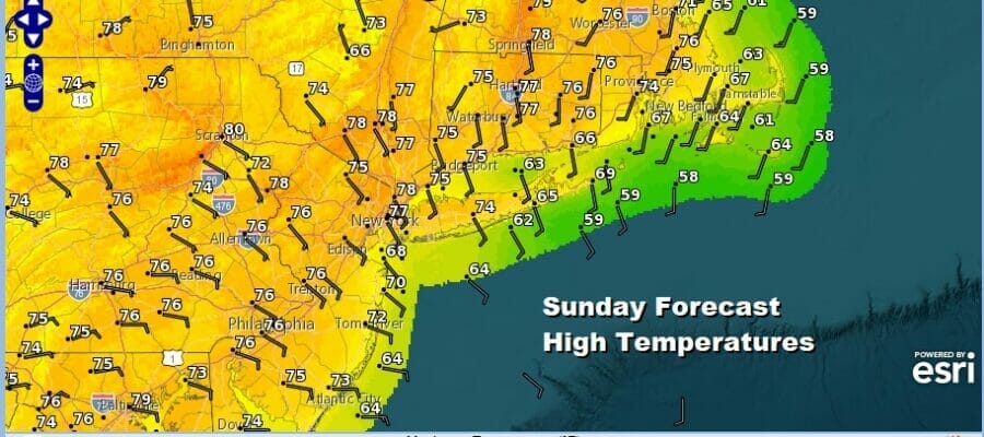 A subtle change in the wind direction and a lack of a new air mass or a cold front will bring temperatures a little high Wednesday with no worse than partly sunny skies. Highs will be in the mid to upper 70s along the coast and into the lower 80s inland. Thursday however we will see more of a west wind and with sunshine we could see highs reach the upper 80s to some lower 90s. The same will hold for Friday.