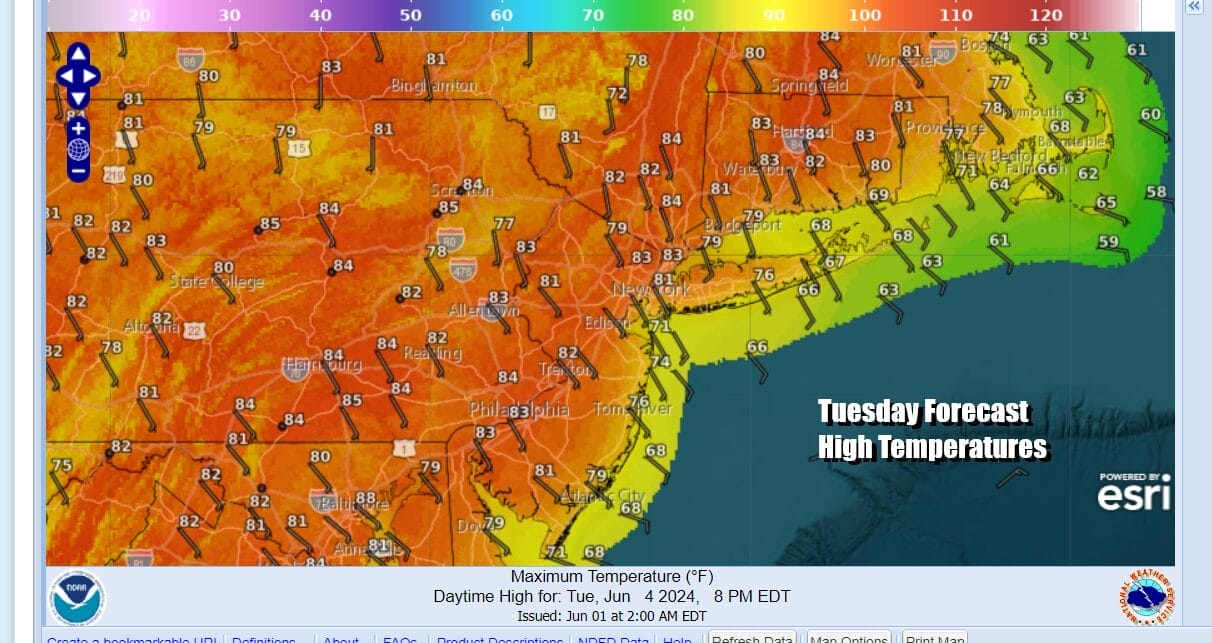 Wednesday sees an approaching cold front into the Eastern US so we expect to see sunshine Wednesday give way to some arriving clouds. Temperatures will be topping out again into the 80s in most inland areas but the winds from off the ocean will once again keep the coastal areas of New Jersey, Long Island & Southern New England in the 70s.