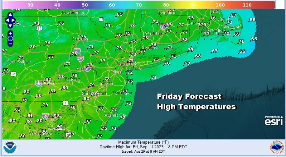 We have arrived at the doorstep of the Labor Day holiday weekend and the timing is perfect for a dry weather pattern to settle into the Eastern US. Today is going to be another nice day of sunshine. Post Tropical Storm Idalia is well offshore as it heads east southeastward toward Bermuda and it will have no impact here. The offshore tropical systems are creating a turbulent ocean so rip currents at the beaches are likely to be an issue all weekend long. Otherwise we are going to see sunshine today take highs up into the 70s with very low humidity. There are no issues on the radar as the Eastern US is will probably not see any showers or thundersstorms at all through the weekend.
