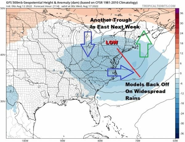 It seems that we can’t buy any meaningful widespread rain this summer. Models overnight have backed off on the idea of widespread rains for the Northeast and Northern Mid Atlantic early next week. Yes there will be the chance for showers with this upper trough dropping into the east but the system is into as dynamic and it is also a bit further east on overnight model runs. For now we will leave the chance for some showery rains in the forecast for the first part of next week and wait to see how this evolves.