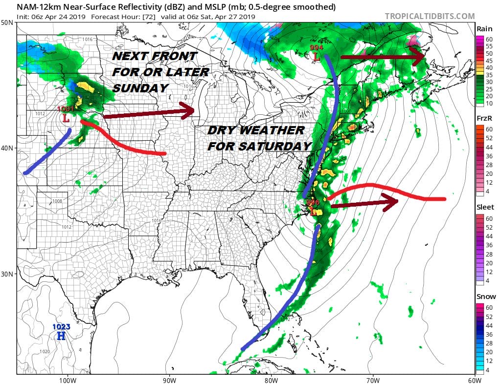 As long as everything moves along weather conditions should improve on Saturday with sunshine returning and highs in the 60s to near 70. The pattern remains fast and another system follows out of the Plains and that one heads for the Great Lakes & New England on Sunday. This is another cold front for us. I’m thinking that Sunday will see clouds with some sun and the risk for late day showers and highs in the 70s. Early next week starts with a shot of cooler air. Sunshine returns with highs Monday in the low to mid 60s. The longer range shows a ridge building in the Eastern US which would lead to warmer than normal conditions however what we can’t see is whether this will come with surface set ups that favor cooler air and being dominated by an onshore flow (wind off the ocean) It is all fine and dandy to have a warm pattern aloft but we don’t live aloft. Often times in the spring what is going on upstairs and what is going on downstairs are two different things. We will examine this in the long range later today.