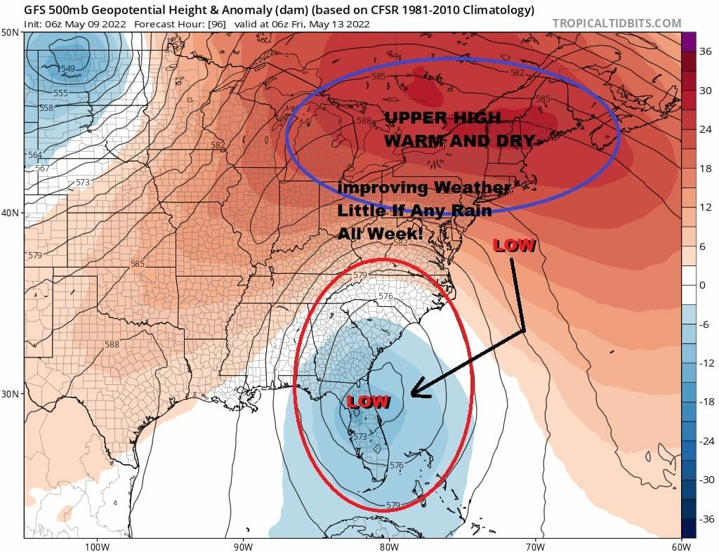 Friday is the day that the upside down nature really plays out with 80s to the north and 70s to the south. Each day this week subtract at least 10 degrees if you are near the coast. On to the weekend where we begin to see the upper atmosphere starting to normalize and the block finishes its breakdown, we will see a cold front approach from the Upper Mississippi Valley and that may probably draw up the chance for showers at some point Saturday and the chance we could see showers and thunderstorms on Sunday. There are hints of severe weather risk for Sunday but it is far to early to determine if that is going to play out. Enjoy the nice weather we have ahead of us today and much of the week.
