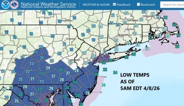 These aren’t the final lows for this morning but we are bottoming in the mid 20s to around 30 degrees and that is creating a destructive freeze for areas where the growing season has begun. The core of this cold air mass will be overhead and moving slowly out to the east today. Satellite loops show clear skies up and down the Eastern Seaboard with an offshore low east of the Carolinas heading eastward. Sunshine will take highs to the upper 40s and lower 50s in most places this afternoon.