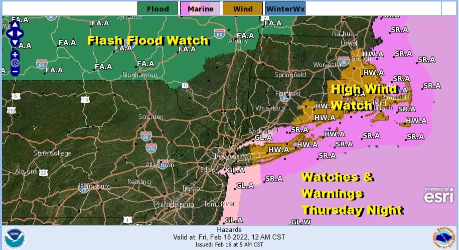 A strengthening storm moving across the Upper Ohio Valley will head to Upstate NY early Friday morning. Coupled with a strong high offshore the pressure gradient will tighten up and it will become breezy Thursday and Windy Thursday night. The first High Wind Watches are up for Southeastern New England to Southeast Connecticut and Suffolk County on Long Island. I suspect we will see wind advisories going up for much of the area. Winds will likely gust 35 to 40 mph inland and 40 to 50 mph along the coast during Thursday night.