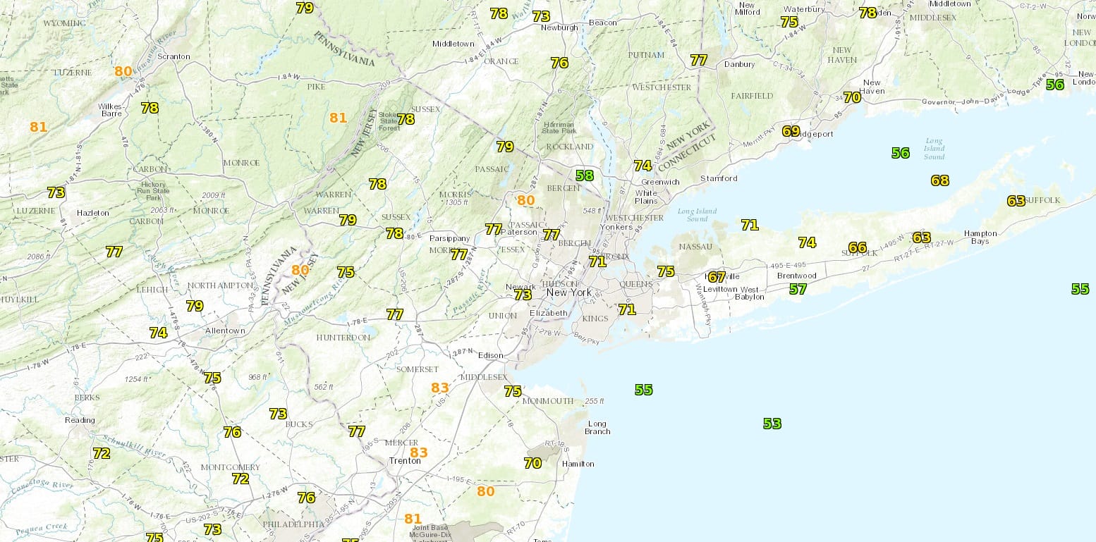 As we are nearing the time for the highs of the day, we have lots of sunshine everywhere except for a few clouds in Southern New Jersey and Southeastern Pennsylvania. Temperatures are in the 70s everywhere as of 2pm. Even a few 80 degree readings are showing up. Winds are very light easterly and there will be local sea breezes kicking in shortly along shore areas but it should not be a huge sea breeze.